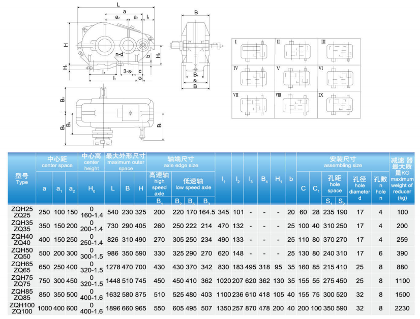 產品型號:ZQ250、ZQ350、ZQ400、ZQ500、ZQ650、ZQ750、ZQ850、ZQ1000。公稱傳動比:8、10、12.5、16、20、25、31.5、40、50。ZQ圓柱齒輪減速機外形尺寸: